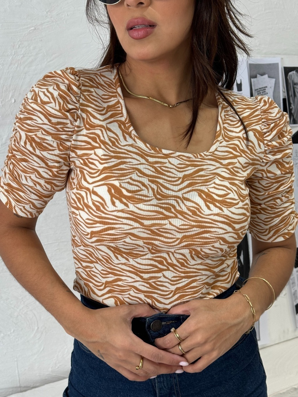 Remera de morley estampado manga frunce con elastico, cuello trapecio.